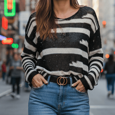 This thin knitted blouse is the ideal choice for women who want to add a touch of refined and subtle style to their everyday outfits. Its fine texture, made entirely of quality viscose, offers a pleasant touch and excellent comfort, making it suitable for long-term wear without discomfort. The contemporary design is highlighted by discreet stripes and finely integrated sequins, adding a delicate shine that attracts the eye in an elegant and balanced way.