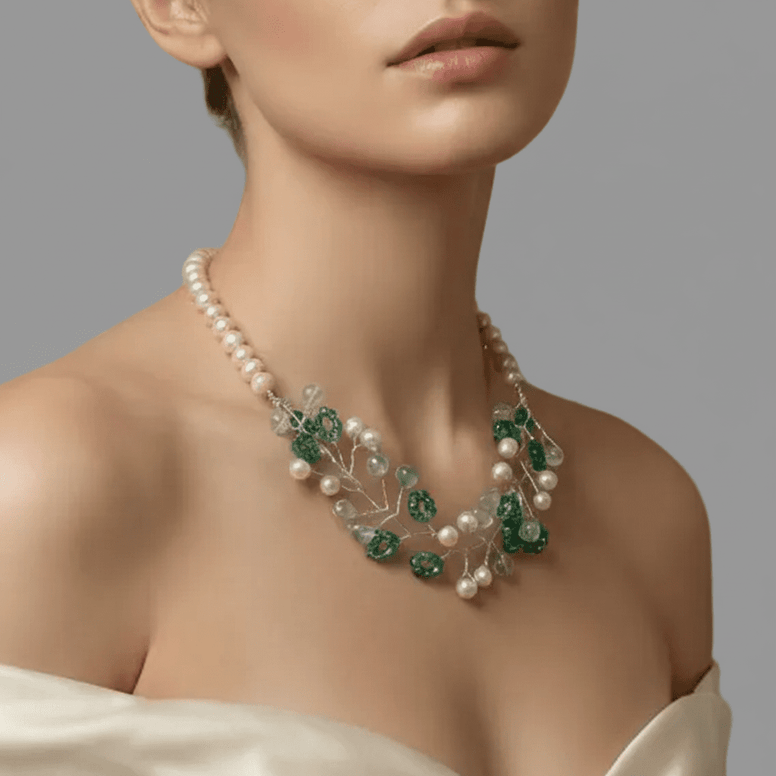 Caracteristici: Combinație unică de perle și fluorit, finisaje din argint autentic, lucrat manual cu sârmă de modelaj, ambalare elegantă cadou. Fiecare colier este unic, exact ca tine.