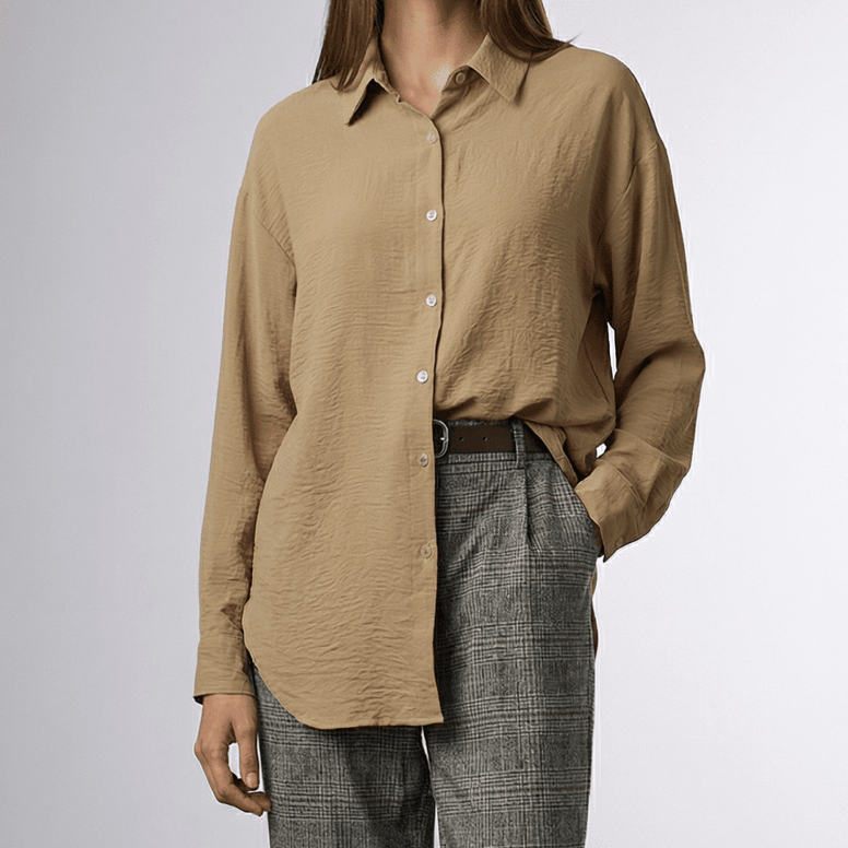 The elegant cream shirt offers a warm alternative to classic white, adding finesse and brightness to outfits. The light and breathable material ensures comfort, while the loose cut offers freedom of movement and a fluid fall. The cream shade matches trousers in beige, brown, black or denim tones, being suitable for the office, meetings or casual-chic outings. The fine texture supports a tidy look, with a discreet shine that elevates the entire composition. You can style the shirt tucked in at the waist for a well-defined contour or worn loose for a relaxed attitude. It is easy to maintain and remains a versatile option season after season. The cream shirt is a refined base for your wardrobe, ideal when you are looking for a balance between simplicity and style.