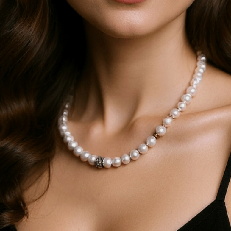 Discover the timeless elegance of this necklace, a refined creation made of sterling silver and irregular cultured pearls. Each pearl, with its unique shape and gray pearly reflections, adds a touch of originality and sophistication. The design is harmoniously complemented by delicate 3 mm silver beads.
