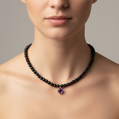 This faceted onyx necklace with a heart-shaped pendant is designed for women who want to add a touch of sophistication and expressiveness to their outfits. Onyx, known for its deep elegance and symbolism related to trust and protection, gives the necklace a strong and sophisticated presence. The 6mm semi-precious stones are carefully faceted to reflect light in a subtle way, offering a discreet glow, ideal for both day and evening appearances.