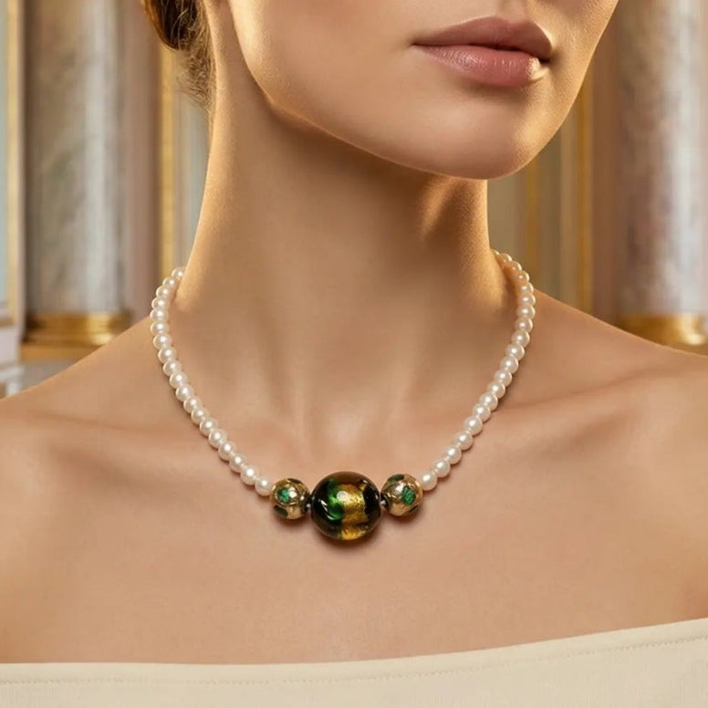 Nu este un colier clasic, uniform sau rigid. Este o piesă cu personalitate, echilibrată vizual, care combină eleganța perlelor cu expresivitatea sticlei Murano.
