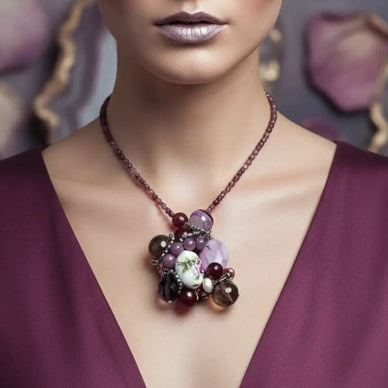 • Pendant with mixed stones: Ruby, Jade, Cultured Pearls, Agate, Garnet, Hematite, Hand-painted ceramic stone.