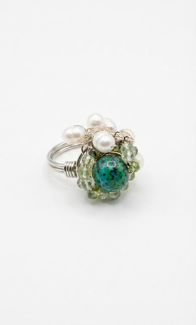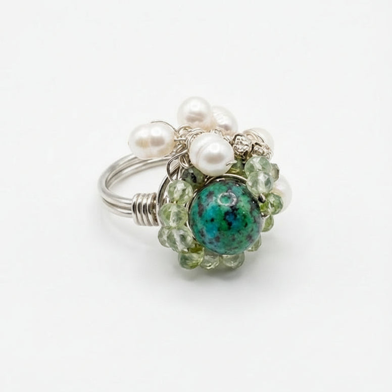 Artistic Composition "Wire Wrapped" The ring design is made in the "cluster" style, a technique that provides volume and texture. The green stone, spherical and imposing, sits in the center of an asymmetrical crown of pearls of different sizes. Everything is "woven" by hand with silver wire, a technique that guarantees the durability of the setting and the uniqueness of each piece.