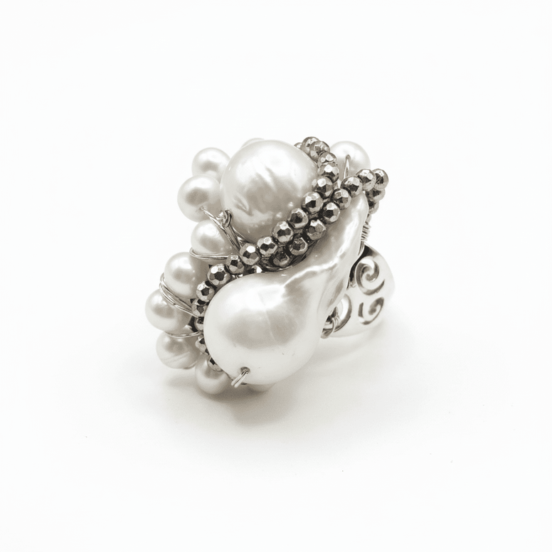 Handmade Statement Ring with Natural Baroque Pearls and Hematite Crystals – Unique Design | OK-LUX