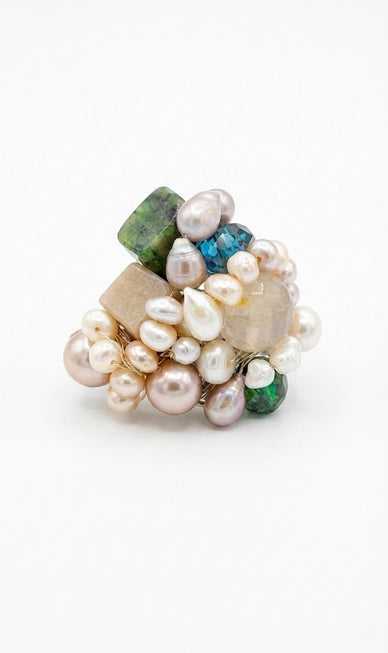 Descopera eleganta atemporala a acestui inel statement, o piesa handmade realizata cu atentie meticuloasa la detalii. Inelul imbina intr-o compozitie voluminoasa elemente naturale si texturi contrastante, creand un design modern si sofisticat. Montura tip cluster pune in valoare armonia dintre perlele naturale, pietrele semipretioase si cristalele fatetate, rezultand o bijuterie cu identitate puternica.