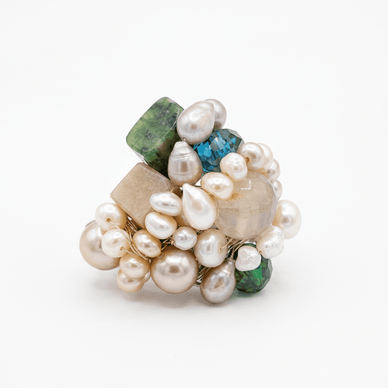 Piesă statement handmade unică confecționată manual de designerul Laura Stoica. Acest inel de bijuterie artizanală îmbină perle naturale de cultură în tonuri alb, crem și roz blush, pietre semipreciase verde smarald (cuarț natural) și cristale fațetate albastru închis/negru într-o compoziție voluminoasă și expresivă de tip Royal Cluster.
