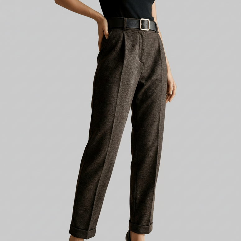 Pantaloni eleganti maro inchis cu croiala dreapta si talie inalta