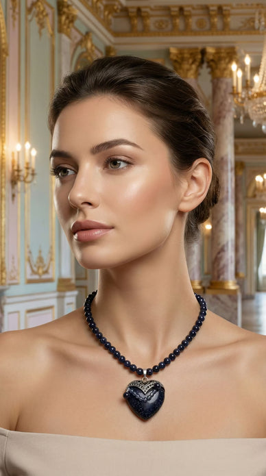 Design și Caracteristici Vizuale Piesa este definită de Piatra Soarelui Albastră (Blue Goldstone), un material renumit pentru negrul-albăstrui intens presărat cu mii de particule sclipitoare care reflectă lumina asemeni stelelor. Șiragul este compus din mărgele sferice uniforme, care conduc privirea către elementul central.