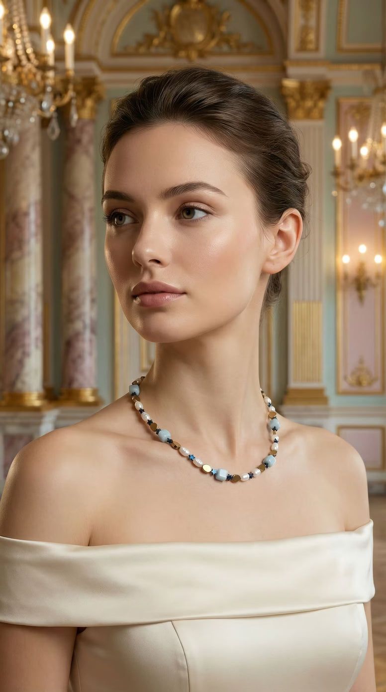 Design și Caracteristici Vizuale Structura colierului se bazează pe un ritm vizual captivant. Elementele de bază sunt cuburile fațetate de Acvamarin (sau piatră naturală cu aspect similar), într-o nuanță translucidă de bleu pastel. Acestea sunt temperate de perle naturale de cultură, cu formă inelată și luciu sidefat, care aduc o notă de clasicism.