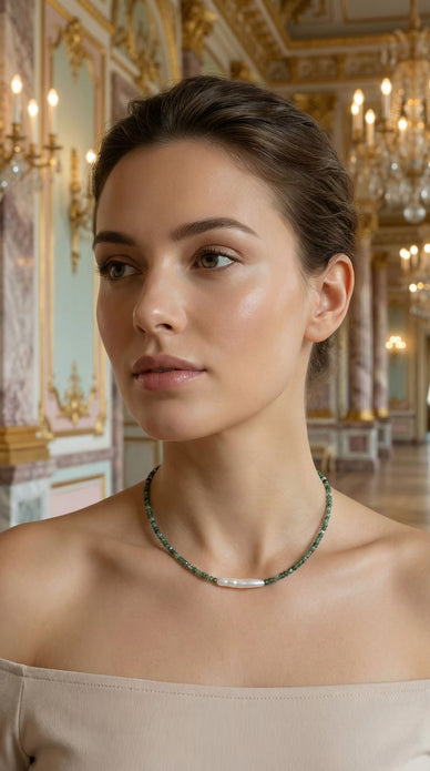 Femeie purtând un colier scurt la baza gâtului din pietre verzi fațetate și perlă alungită, asortat la o rochie crem cu umerii goi.