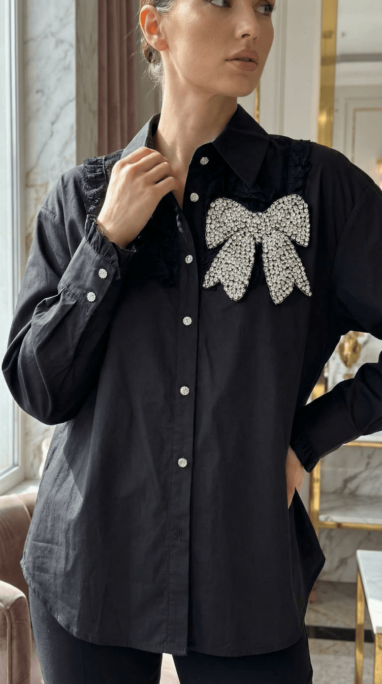 Cămașă Statement „Crystal Bow” – Neagră cu Fundă și Cristale