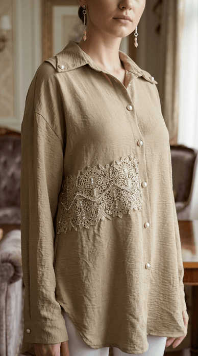 Aceasta camasa este o piesa statement cu o estetica naturala si rafinata, construita pentru femeile care apreciaza detaliile lucrate manual.