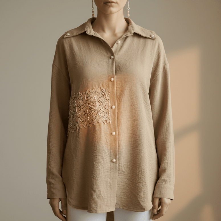Cămașă Bej Accesorizată Manual cu Dantelă și Cristale – Handmade