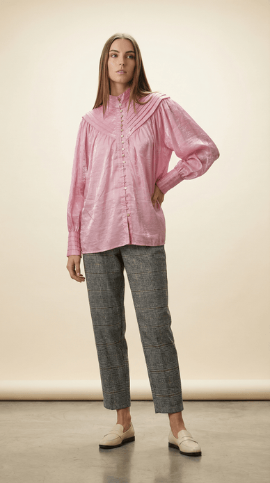 • Camasa roz metalezata cu guler inalt si detalii plisate in zona umerilor.