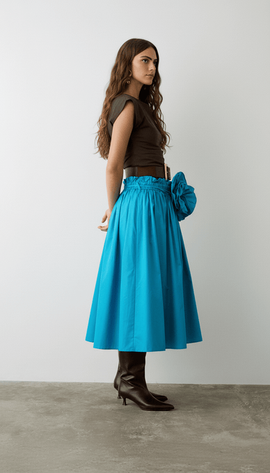 Această fustă lungă din eco piele albastru ciel îmbină eleganța modernă cu confortul contemporan. Textura fină și croiala fluidă accentuează silueta, adăugând un plus de rafinament și stil. Perfectă pentru birou, plimbări urbane sau evenimente casual-chic, oferă un look sofisticat și fresh. Completează-ți ținuta cu o cămașă albă sau top minimalist pentru un contrast elegant, rafinat.