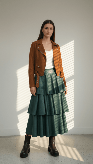 Fusta se remarcă prin versatilitatea sa, putând fi combinată cu bluze vaporoase sau pulovere fine, pentru un stil echilibrat și plin de eleganță.