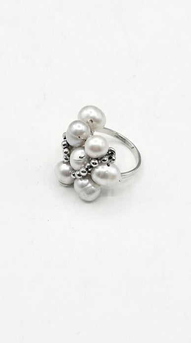 Acest inel este o piesa statement construita sub forma unui cluster bogat de perle naturale albe, cu stralucire sidefata discreta.