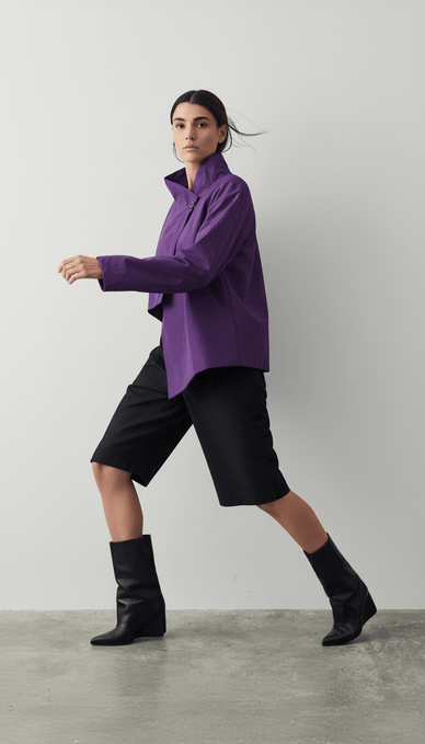 Jacheta mov, cu o croială modernă și relaxată, aduce o pată de culoare vibrantă oricărei ținute. Designul cu talie unică și bust generos oferă libertate de mișcare și un confort sporit pe tot parcursul zilei. Lungimea versatilă, de 55 cm, o face ușor de asortat cu piese casual sau elegante, creând un look echilibrat. Nuanța intensă de mov transformă această jachetă într-un element central al garderobei. Este alegerea ideală pentru a-ți exprima personalitatea prin stil. Perfectă pentru zilele răcoroase, această jachetă mov adaugă un plus de rafinament și energie fiecărei apariții.